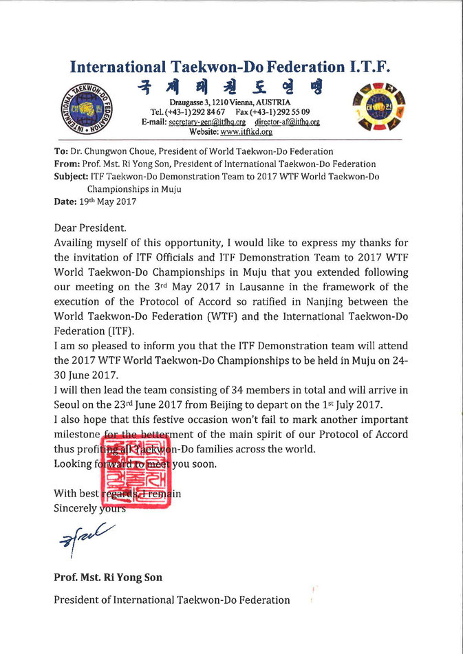 Availing myself to this opportunity, I would like to express my thanks for the invitation of ITF Officials and ITF Demonstration Team to 2017 WTF World Taekwon‑Do Championships in Muju that you extended following our meeting on the 3rd May 2017 in Lausanne in the framework of the execution of the Protocol of Accord so ratified in Nanjing between the World Taekwon‑Do Federation (WTF) and the International Taekwon‑Do Federation (ITF).